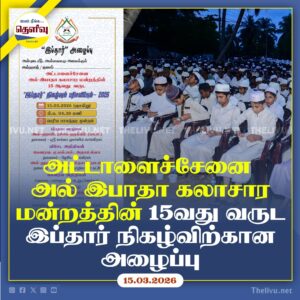 Read Moreஅட்டாளைச்சேனை அல் இபாதா கலாசார மன்றத்தின் 15வது ஹதீஸ் மஜ்லீஸ் இப்தார் நிகழ்வு இன்று பெரிய பாலத்தடி முன்றலில் நடைபெறவுள்ளது.