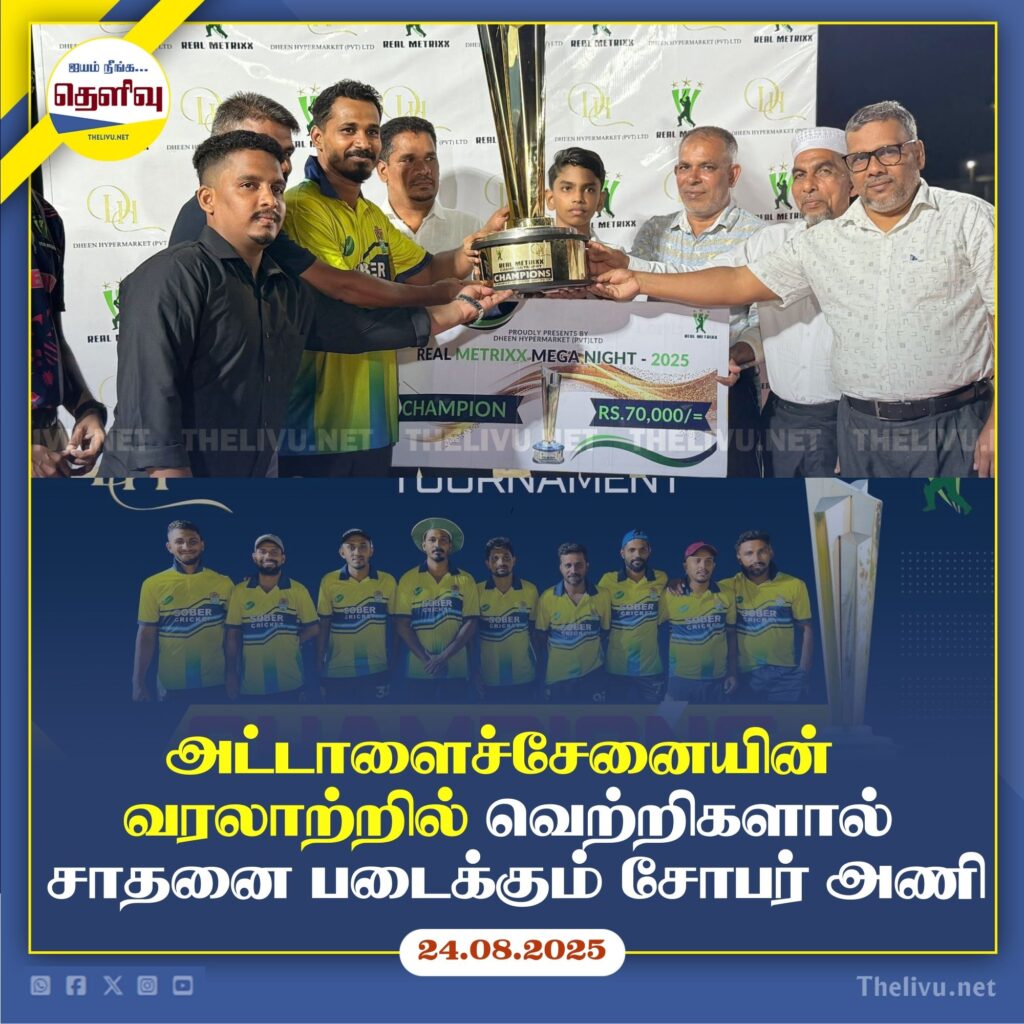 அட்டாளைச்சேனை சோபர் விளையாட்டு கழகம், “REAL METRIXX MEGA NIGHT 2025” மாபெரும் மென்பந்து கிரிக்கெட் சுற்றுப்போட்டியின் இறுதிப் போட்டியில் வெற்றி பெற்று சாம்பியன் பட்டத்தையும், 70,000 ரூபாய் பணப்பரிசையும் கைப்பற்றியது.
