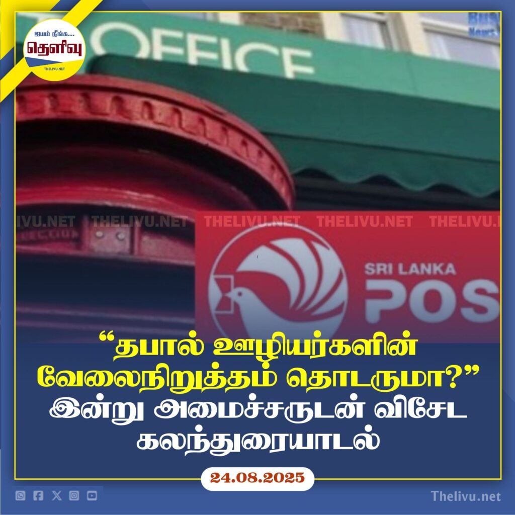 கடந்த 17ஆம் திகதி ஆரம்பிக்கப்பட்ட தபால் ஊழியர்களின் வேலைநிறுத்தத்துக்கு தீர்வு காண இன்று (24) தொலைத்தொடர்பு மற்றும் தபால் சேவைகள் அமைச்சர் நளிந்த ஜயதிஸ்ஸவுடன் விசேட கலந்துரையாடல் நடைபெற உள்ளது.