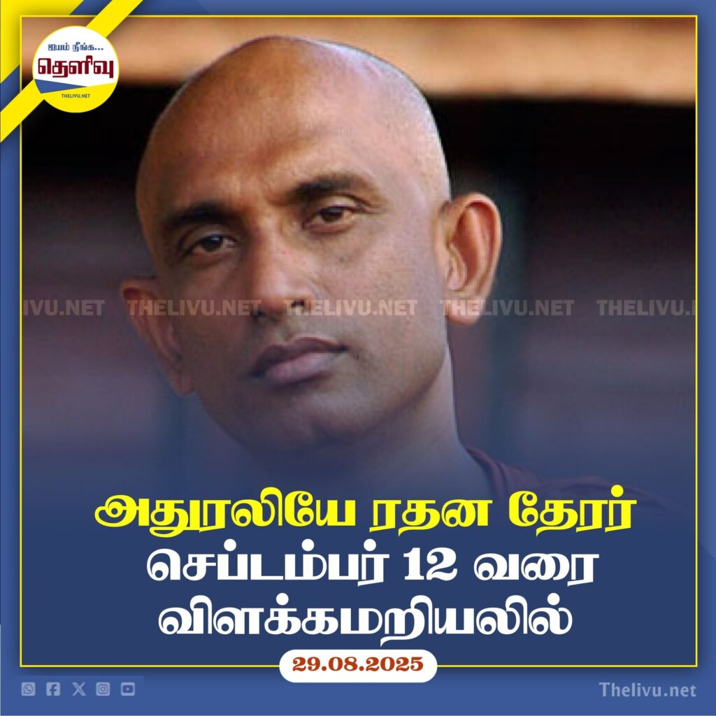 நுகேகொடை நீதிமன்றத்தில் இன்று (29) பிற்பகல் ஆஜரான வணக்கத்திற்குரிய அதுரலியே ரதன தேரர், எதிர்வரும் செப்டம்பர் 12 ஆம் திகதி வரை விளக்கமறியலில் வைக்க நீதிமன்றம் உத்தரவிட்டது.