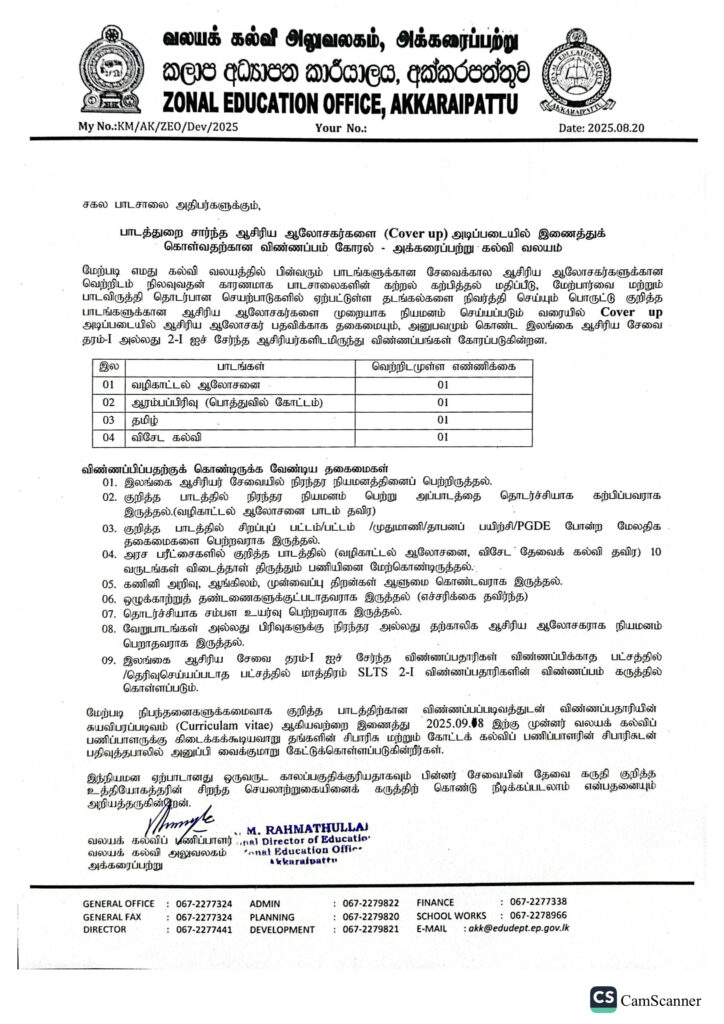அக்கரைப்பற்று கல்வி வலயத்தில் வெற்றிடமாக உள்ள ஆசிரியர் ஆலோசகர் பதவிகளை தற்காலிக அடிப்படையில் (Cover up) நிரப்புவதற்கான அறிவிப்பை அக்கறைப்பற்று கல்வி அலுவலகம் வெளியிட்டுள்ளது.