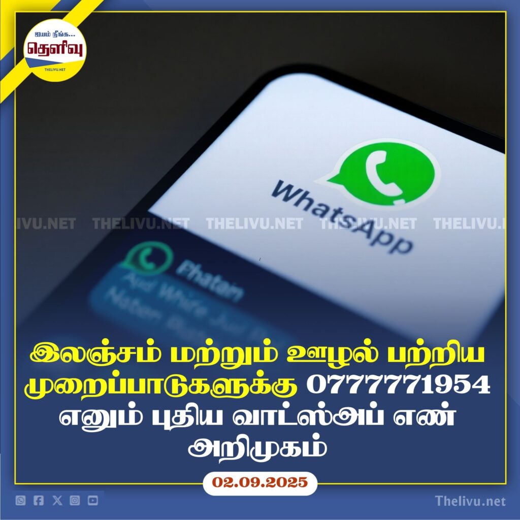 இலஞ்சம் அல்லது ஊழல் பற்றிய குற்றச்சாட்டுகளைப் புலனாய்வு செய்யும் ஆணைக்குழு, 077 777 1954 என்ற வாட்ஸ்அப் எண்ணை பொதுமக்கள் பயன்பாட்டிற்கு திறந்துவைத்துள்ளது.