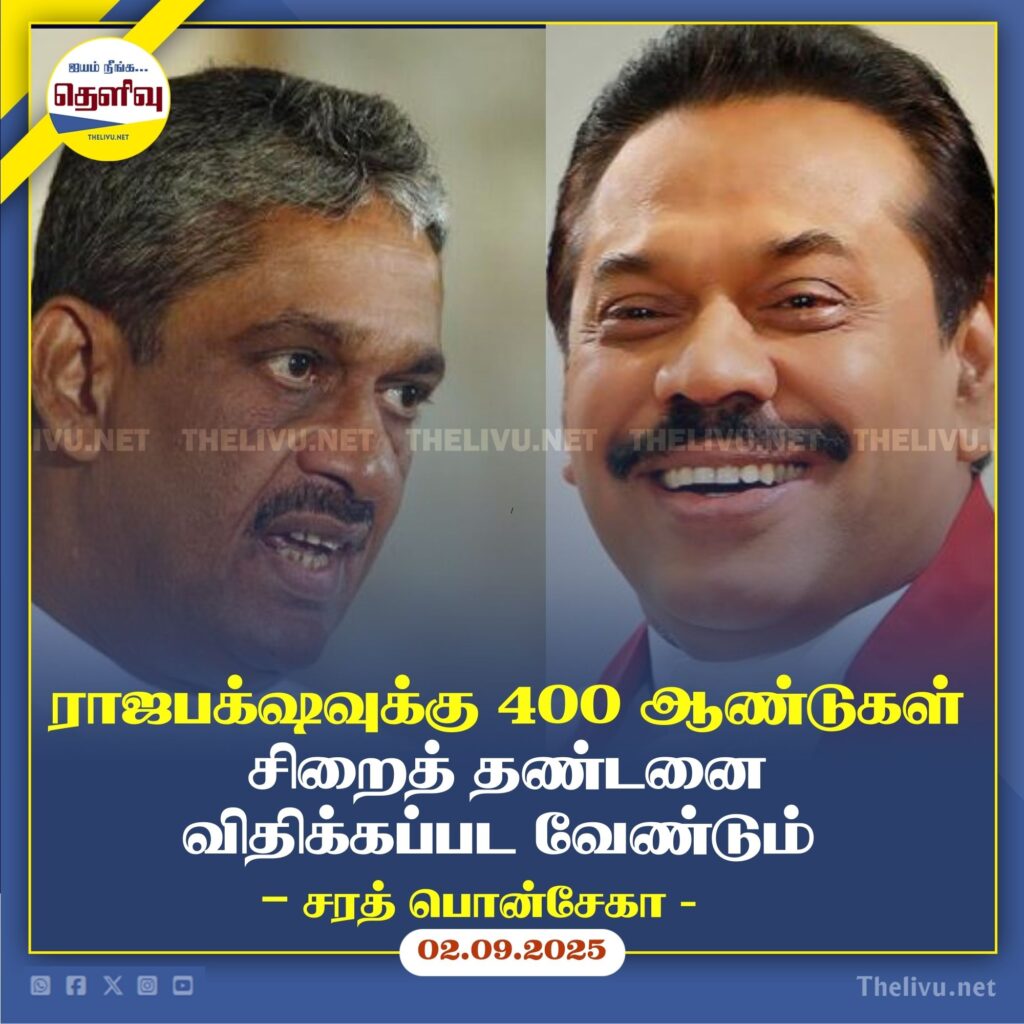 முன்னாள் ஜனாதிபதி மஹிந்த ராஜபக்ஷவுக்கு 400 ஆண்டுகள் சிறைத் தண்டனை விதிக்கப்பட வேண்டும் என முன்னாள் இராணுவத் தளபதி மற்றும் நாடாளுமன்ற உறுப்பினர் பீல்ட் மார்ஷல் சரத் பொன்சேகா தெரிவித்துள்ளார்.
