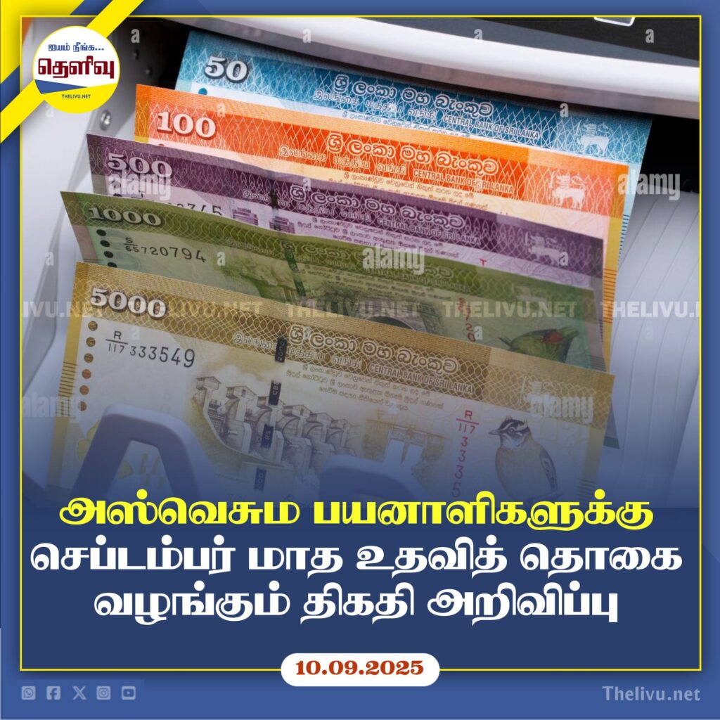 2025 ஆம் ஆண்டுக்கான செப்டம்பர் மாத அஸ்வெசும நிவாரண உதவித் தொகை நாளை மறுநாள் (12) முதல் பயனாளிகளின் வங்கிக் கணக்குகளில் வரவு வைக்கப்படும் என நலன்புரி நன்மைகள் சபை அறிவித்துள்ளது.