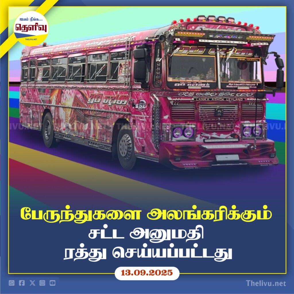 பேருந்துகளை அலங்கரிப்பதற்கும் கூடுதல் பாகங்களை பொருத்துவதற்கும் சட்டபூர்வ அனுமதி வழங்கி வெளியிடப்பட்டிருந்த சுற்றறிக்கை அதிகாரப்பூர்வமாக ரத்து செய்யப்பட்டுள்ளது என்று மோட்டார் வாகன போக்குவரத்துத் திணைக்களம் அறிவித்துள்ளது.