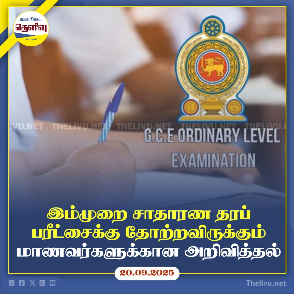 கல்வி அமைச்சு வெளியிட்ட விசேட அறிவிப்பில், 2025 (2026) கல்விப் பொதுத் தராதர சாதாரண தரப் பரீட்சைக்கான விண்ணப்பங்கள் 2025 செப்டம்பர் 18 முதல் ஒக்டோபர் 9 வரை இணையவழியாக ஏற்றுக்கொள்ளப்படும் என தெரிவிக்கப்பட்டுள்ளது.