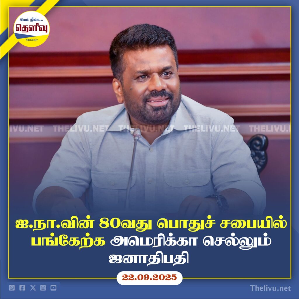 ஜனாதிபதி அநுரகுமார திசாநாயக்க இன்று (22) இரவு அமெரிக்காவிற்கு புறப்படுகிறார். இப்பயணத்தின் போது அவர், ஐக்கிய நாடுகள் சபையின் 80வது பொதுச் சபை அமர்வில் பங்கேற்க உள்ளார். எதிர்வரும் புதன்கிழமை (24) உள்ளூர் நேரப்படி பிற்பகல் 3.15 மணிக்கு ஐ.நா. பொதுச் சபையில் உரையாற்றும் நிகழ்வும் நடைபெற உள்ளது.