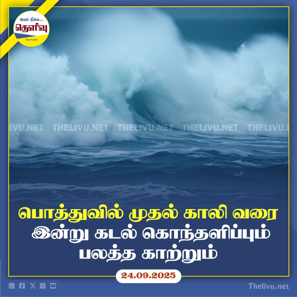 இலங்கையின் பல கடற்கரைப் பகுதிகளில் இன்று (24.09.2025) பலத்த காற்று மற்றும் கடல் கொந்தளிப்பு ஏற்படும் அபாயம் உள்ளதாக வானிலை திணைக்களம் எச்சரிக்கை விடுத்துள்ளது.