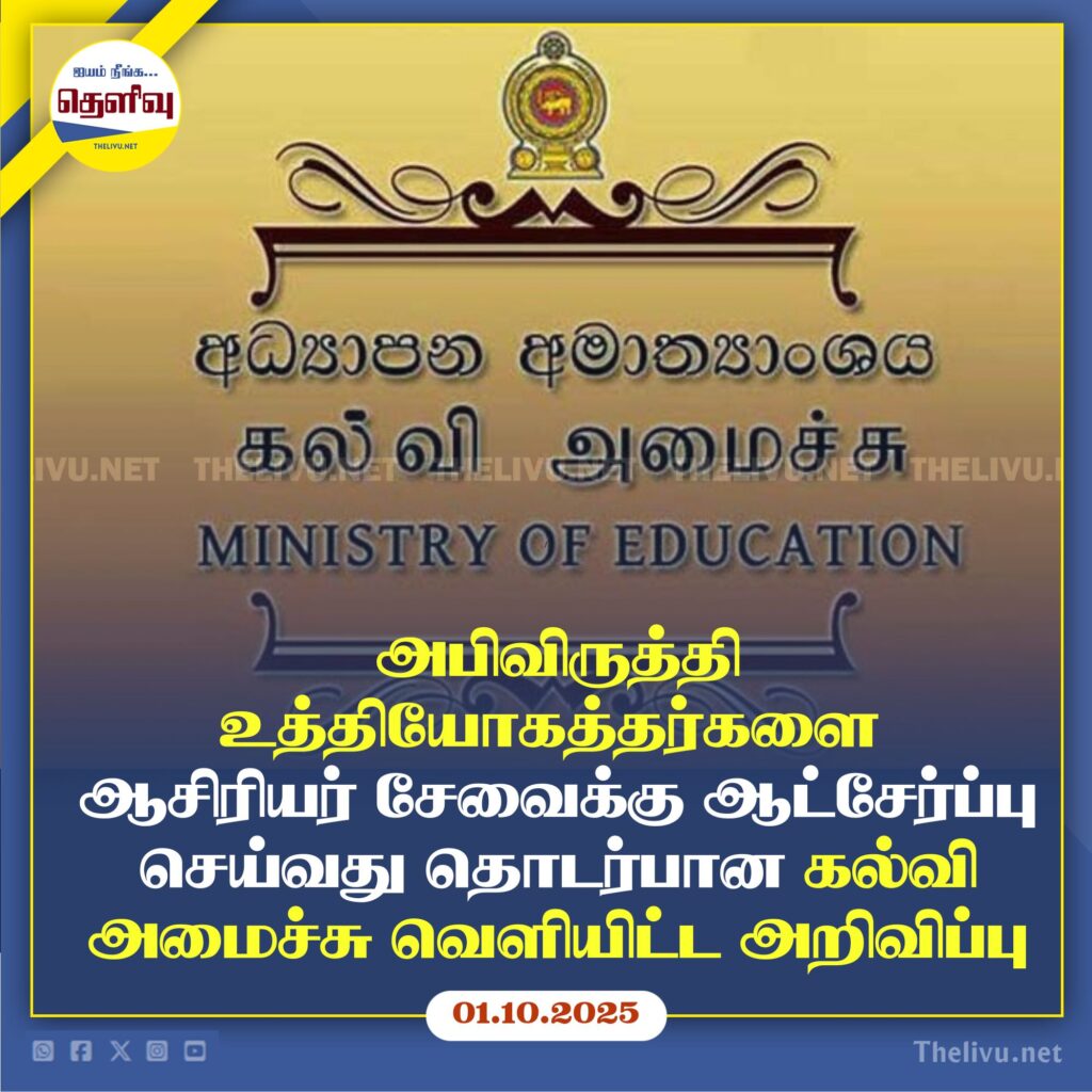 பாடசாலைகளில் பணியாற்றி வரும் அபிவிருத்தி அதிகாரிகளை ஆசிரியர் சேவைக்கு ஆட்சேர்ப்பு செய்வது தொடர்பான அதிகாரப்பூர்வ அறிவிப்பை கல்வி, உயர்கல்வி மற்றும் தொழிற்கல்வி அமைச்சு அமைச்சின் செயலாளர் நாலக கலுவெவவின் கையொப்பத்துடன் வெளியிட்டுள்ளது.
