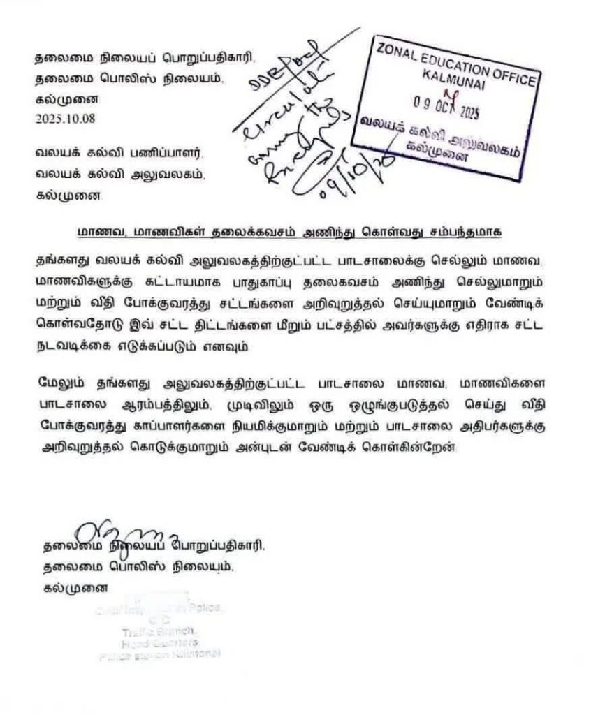 கல்முனை தலைமையக பொலிஸ் பிரிவின் கீழ் செயல்படும் கல்முனை கல்வி வலயத்திற்குட்பட்ட பாடசாலைகளுக்குச் செல்லும் மாணவ, மாணவிகள் தங்களது பாதுகாப்பிற்காக கட்டாயமாக தலைகவசம் (Helmet) அணிந்து செல்ல வேண்டும் என கல்முனை தலைமையக பொலிஸ் நிலையப் பொறுப்பதிகாரி லசந்த களுவாராய்ச்சி அறிவித்துள்ளார்.