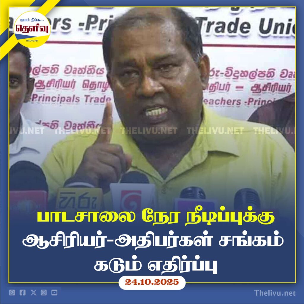 இன்று (24) கொழும்பில் நடைபெற்ற ஊடகவியலாளர் சந்திப்பில், ஆசிரியர்-அதிபர் சங்கங்கள், “நவம்பர் 7ஆம் திகதிக்கு முன்னர் பாடசாலை நேர திருத்தம் குறித்த முடிவை அரசு மாற்றவில்லை எனில் புதிய தவணை தொடங்கியவுடன் ஒருநாள் வேலைநிறுத்தப் போராட்டம் நடத்தப்படும்” என்று எச்சரித்துள்ளன.