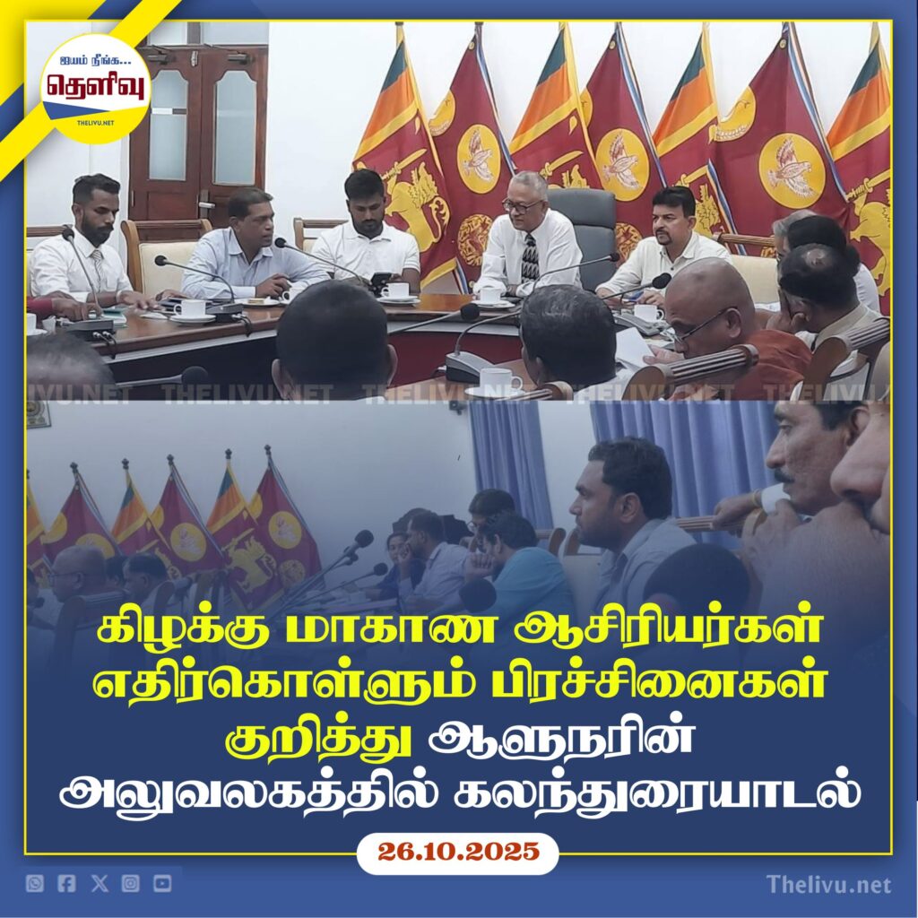 கிழக்கு மாகாண ஆசிரியர்கள் எதிர்நோக்கும் பிரச்சினைகள் தொடர்பான முக்கியமான கலந்துரையாடல் நேற்று (25.10.2025) கிழக்கு மாகாண ஆளுநரின் அலுவலகத்தில் இலங்கை ஆசிரியர் சேவை சங்கத்தின் பொதுச் செயலாளர் மற்றும் பிரதி அமைச்சர் மஹிந்த ஜெயசிங்க அவர்களின் தலைமையில் நடைபெற்றது.
