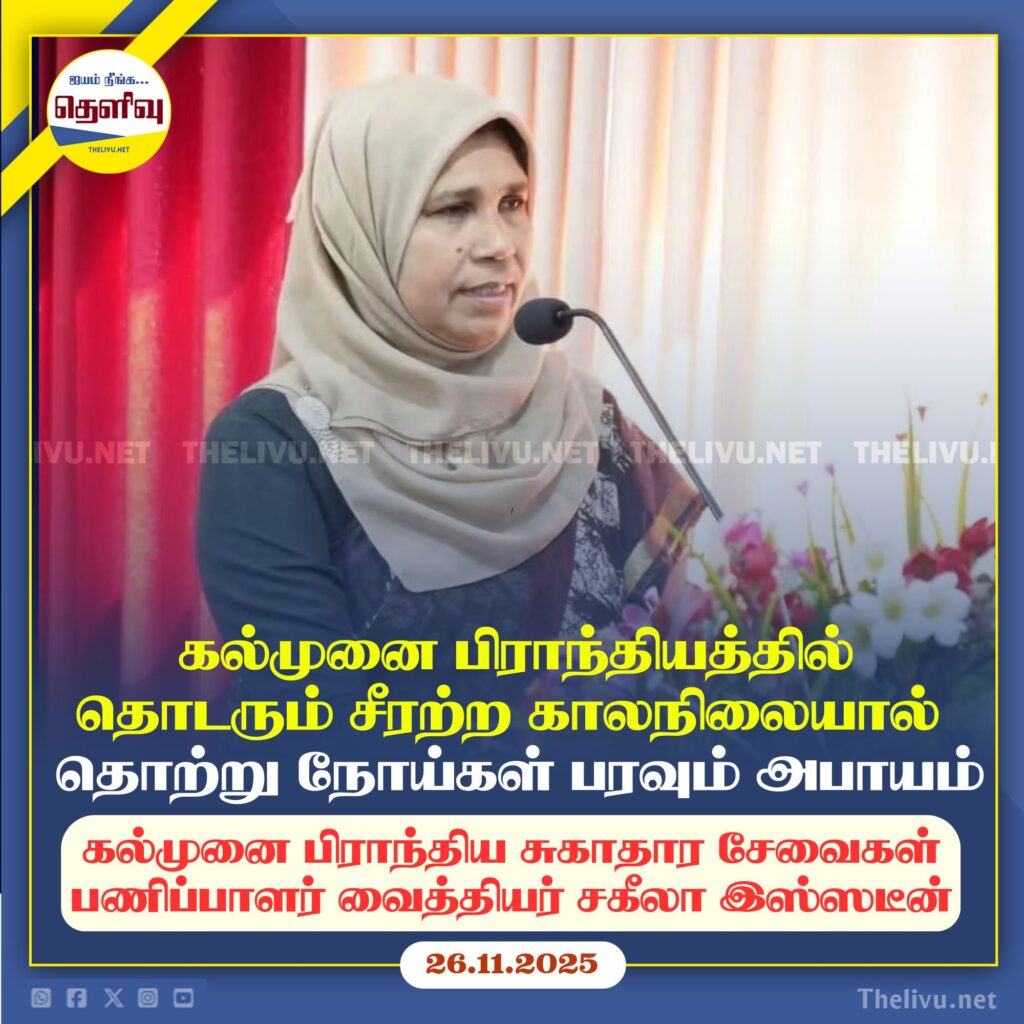 கல்முனை பிராந்தியத்தில் நிலவும் சீரற்ற காலநிலை காரணமாக வெள்ள அனர்த்தம் மற்றும் தொற்று நோய்கள் பரவும் அபாயம் ஏற்பட்டுள்ளதால், பொதுமக்கள் மிகுந்த விழிப்புணர்வுடன் செயற்படுமாறு கல்முனை பிராந்திய சுகாதார சேவைகள் பணிப்பாளர் வைத்திய கலாநிதி சகீலா இஸ்ஸடீன் வேண்டுகோள் விடுத்துள்ளார்.