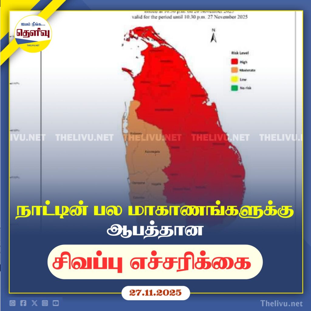 நேற்று பிற்பகல் வெளியிடப்பட்ட அறிவிப்பில், நவம்பர் 29 வரை பொதுமக்கள் மிகுந்த அவதானத்துடன் செயல்பட வேண்டுமெனக் கேட்டுக்கொள்ளப்பட்டுள்ளது. தற்போது அமுலில் உள்ள சிவப்பு எச்சரிக்கை இன்று (27) இரவு 10.30 மணி வரை நீடிக்கப்பட்டுள்ளதாகவும் தெரிவிக்கப்பட்டுள்ளது.