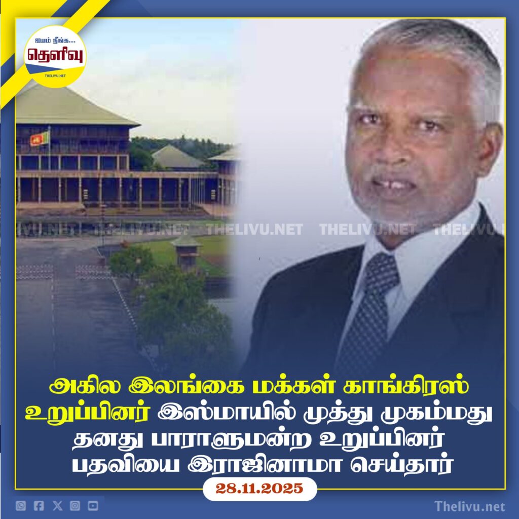 அகில இலங்கை மக்கள் காங்கிரஸ் கட்சியின் உறுப்பினரான இஸ்மாயில் முத்து முஹம்மது ஐக்கிய மக்கள் சக்தியின் தேசியப் பட்டியல் ஊடாக பாராளுமன்ற உறுப்பினராக நுழைந்தவர் தனது பாராளுமன்ற உறுப்பினர் பதவியை இராஜினாமா செய்வதாக அறிவித்தார்.