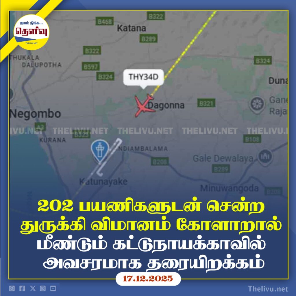 தொழில்நுட்பக் கோளாறு காரணமாக துருக்கியின் இஸ்தான்புல் நோக்கிப் பயணித்த விமானம் மீண்டும் திருப்பப்பட்டு கட்டுநாயக்க பண்டாரநாயக்க சர்வதேச விமான நிலையத்தில் (BIA) பாதுகாப்பாகத் தரையிறக்கப்பட்டதாக விமான நிலையத் தகவல்கள் தெரிவித்துள்ளன.