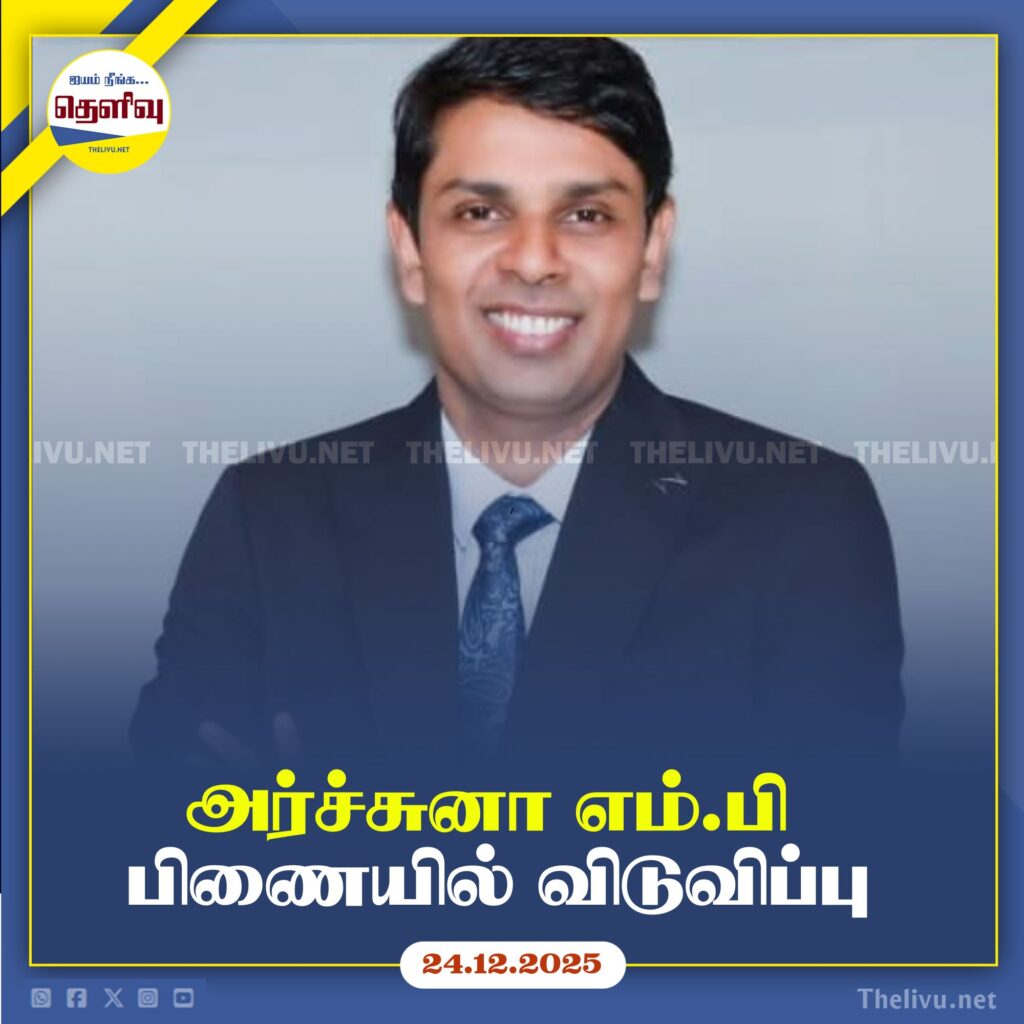 நீதிமன்றம் பிறப்பித்த பிடியாணை அமுலில் இருந்த நிலையில் பாராளுமன்ற உறுப்பினர் இராமநாதன் அர்ச்சுனா இன்று (24) கோட்டை பொலிஸ் நிலையத்தில் சரணடைந்தார். அதன் பின்னர் கோட்டை நீதவான் நீதிமன்றத்தில் ஆஜர்படுத்தப்பட்ட அவரை நீதவான் பிணையில் விடுவிக்க உத்தரவிட்டுள்ளார்.