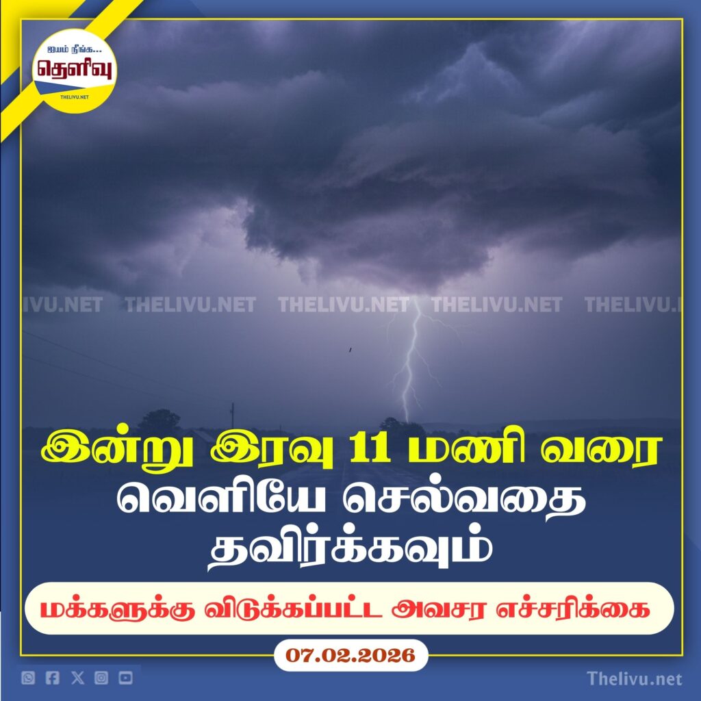 வளிமண்டலவியல் திணைக்களத்தின் இயற்கை அனர்த்தம் தொடர்பான முன்னெச்சரிக்கை மையம் இன்று (07) நண்பகல் 12.00 மணியளவில் கடும் மின்னல் தாக்கம் தொடர்பாக ‘செம்மஞ்சள்’ நிற எச்சரிக்கையை வெளியிட்டுள்ளதுடன் இவ் எச்சரிக்கை இன்று இரவு 11.00 மணி வரை அமுலில் இருக்கும் என அறிவிக்கப்பட்டுள்ளது.