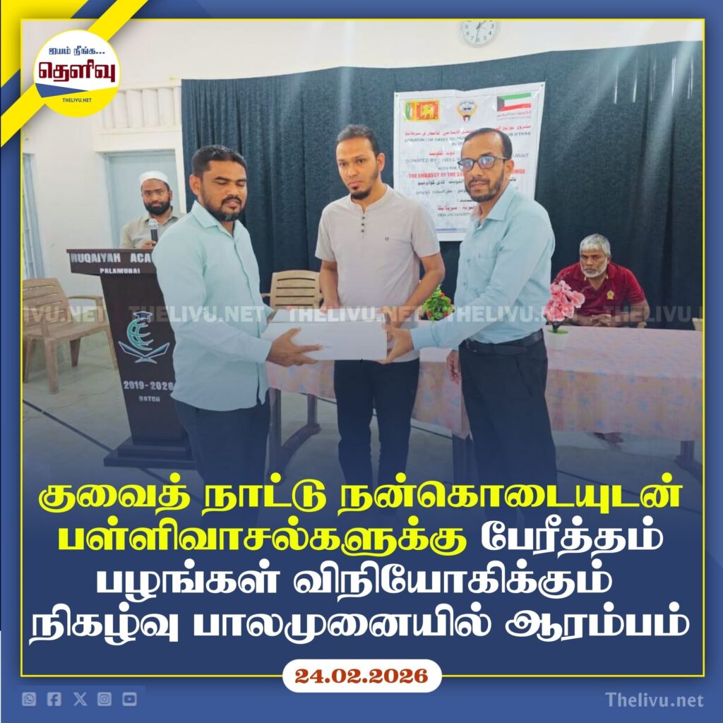 புனித ரமழான் மாதத்தை முன்னிட்டு குவைத் நாட்டு மக்களின் தாராள நிதிப் பங்களிப்புடன் பள்ளிவாசல்களுக்கு பேரீத்தம் பழங்கள் வழங்கும் மனிதநேய செயற்றிட்டம் அம்பாரை மாவட்ட உலமா சபைத் தலைவரும் சிலோன் செரிட்டி (Ceylon Charity) அமைப்பின் தலைவர் ஐ.எல்.எம். ஹாஸிம் ஸூரி அவர்களின் தலைமையில் 2026.02.22ம் திகதி பாலமுனையில் ஆரம்பிக்கப்பட்டது.