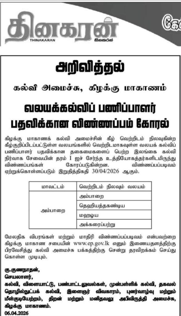 கிழக்கு மாகாண கல்வி அமைச்சின் கீழ் செயல்படும் அக்கரைப்பற்று , அம்பாறை, தெஹியத்தகண்டிய , மஹஓய போன்ற கல்வி வலயங்களில் வெற்றிடமாகவுள்ள வலயக் கல்விப் பணிப்பாளர் பதவிகளை நிரப்புவதற்காக தகுதியானவர்களிடமிருந்து விண்ணப்பங்கள் கோரப்பட்டுள்ளன.