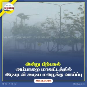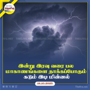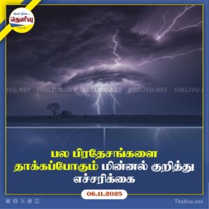 Read Moreவடக்கு, கிழக்கு, ஊவா, வடமத்திய மாகாணங்களில் கடும் மின்னல் தாக்கம் ஏற்படும் வாய்ப்பு குறித்து திணைக்களம் இன்று இரவு வரை எச்சரிக்கை.