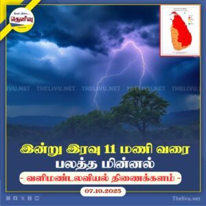 Read Moreஇன்று பிற்பகல் பல மாகாணங்களில் இடியுடன் கூடிய மழை ஏற்படும் வாய்ப்பு. மின்னல் தாக்கத்திலிருந்து பாதுகாப்பாக இருக்க திணைக்களம் எச்சரிக்கை.