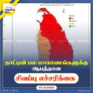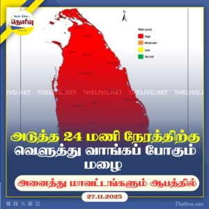 Read Moreஇலங்கையில் கடும் கனமழை காரணமாக சிவப்பு எச்சரிக்கை வெளியிடப்பட்டு, வெள்ளம், நிலச்சரிவு அபாயங்கள் உயர்ந்துள்ளதால் பொதுமக்கள் விழிப்புடன் இருக்க அறிவுறுத்தப்பட்டது.