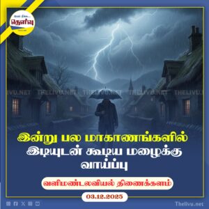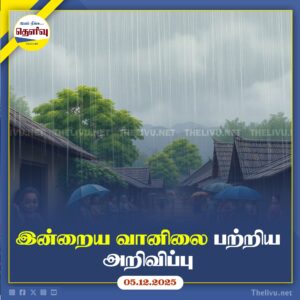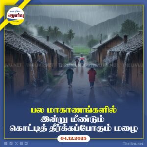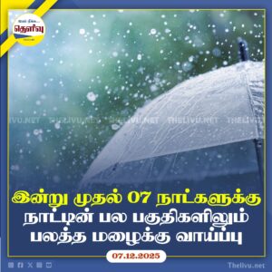 Read Moreடிசம்பர் 7 முதல் 14 வரை இலங்கை முழுவதும் கனமழை ஏற்படும் வாய்ப்பு உள்ளது. மலையகத்தில் மண்சரிவு அபாயம் அதிகரித்துள்ளதால் மக்கள் அவதானமாக இருக்க வேண்டியது அவசியம்.