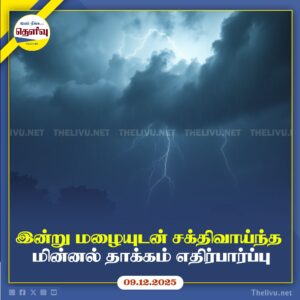 Read Moreநாடு முழுவதும் வடகிழக்கு பருவமழை வலுப்பெற்றதால் பல மாகாணங்களில் 100 மிமீ வரை கனமழை, பலத்த காற்று மற்றும் மின்னல் அபாயம் இருப்பதாக வானிலை திணைக்களம் எச்சரிக்கை.