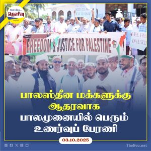 Read Moreஇஸ்ரேல் தாக்குதலால் துன்புறும் பாலஸ்தீனுக்கு ஆதரவாக பாலமுனையில் மக்கள் இணைந்து பெரும் உணர்வுப் பேரணியை முன்னெடுத்தனர்.