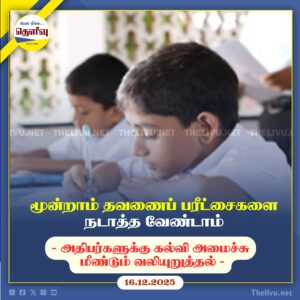 Read More2025 கல்வி ஆண்டில் ஏற்பட்ட அனர்த்தங்கள் காரணமாக 6–10 வகுப்பு மூன்றாம் தவணை பரீட்சைகள் ரத்து செய்யப்பட்டுள்ளதாக கல்வி அமைச்சு அறிவித்துள்ளது.