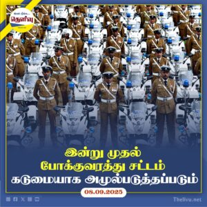 Read Moreஇன்று முதல் நாடு முழுவதும் போக்குவரத்து சட்டம் கடுமையாக அமுல்படுத்தப்படும்; விதிமீறல் வாகனங்களுக்கு பொலிசார் கடுமையான நடவடிக்கை எடுப்பார்கள்.
