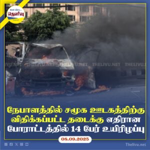 Read Moreநேபாளத்தில் 26 சமூக ஊடக தடை எதிர்ப்பில் காத்மாண்டுவில் போராட்டம் தீவிரம்; நாடாளுமன்ற முற்றுகை, காவல் துறையின் துப்பாக்கிச் சூட்டில் 14 உயிரிழப்பு.