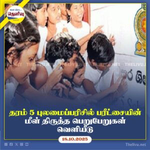 Read More2025 ஆகஸ்ட் 10 நடைபெற்ற தரம் 5 புலமைப்பரிசில் மீள் திருத்த பெறுபேறுகள் வெளியிடப்பட்டுள்ளன. மாணவர்கள் வலைத்தளங்களில் முடிவுகளைப் பார்க்கலாம்.