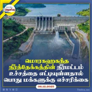 Read Moreமொரகஹகந்த நீர்த்தேக்கத்தில் தற்போது 98.87% நீர் நிரம்பியுள்ளதால் மழை அதிகரிக்குமாயின் வான்கதவுகள் திறக்கப்பட வாய்ப்பு உள்ளது.