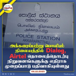 Read MoreDialogமற்றும் Airtelநிறுவனங்கள் சேவை வழங்காமல் கட்டணம் வசூல்,முன்னறிவிப்பின்றி தொலைத்தொடர்பு துண்டித்தமை தொடர்பில் அக்கரைப்பற்று பொலிஸில் முறைப்பாடு பதிவு