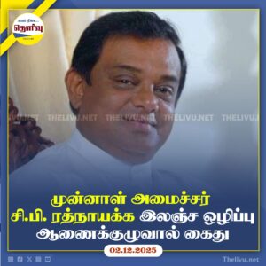 Read Moreமுன்னாள் அமைச்சர் சி.பி. ரத்நாயக்க இன்று இலஞ்சம் மற்றும் ஊழல் விசாரணை ஆணைக்குழுவில் வாக்குமூலம் வழங்கச் சென்றபோது அதிகாரிகளால் கைது செய்யப்பட்டார்.