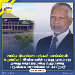 Read Moreஇஸ்மாயில் முத்து முஹம்மது எம்.பி, இன்று பாராளுமன்றத்தில் உரையாற்றி சுய விருப்பத்துடன் தனது பதவியை விலகுவதாக அறிவித்தார்