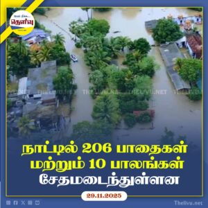 Read Moreசீரற்ற வானிலை காரணமான வெள்ளம் மற்றும் மண்சரிவுகளால் நாட்டில் 206 பாதைகள் மற்றும் 10 பாலங்கள் சேதமடைந்துள்ளன