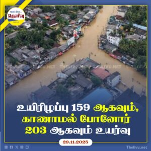 Read Moreசீரற்ற வானிலையினால் உயிரிழப்பு 159 ஆக அதிகரித்துள்ளது. 203 பேர் காணாமல் போயுள்ளனர்.25 மாவட்டங்களில் 8.33 லட்சம் பேர் பாதிப்பு