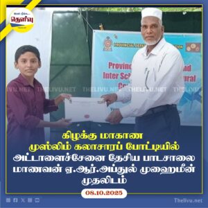 Read Moreஅட்டாளைச்சேனை மாணவன் ஏ.ஆர். அப்துல் முஹைமீன் கிழக்கு மாகாண முஸ்லிம் கலாசாரப் போட்டியில் கிராத் பிரிவில் முதலிடம் பெற்று பெருமை சேர்த்தார்.