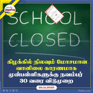 Read Moreசீரற்ற காலநிலை காரணமாக கிழக்கு மாகாண முன்பள்ளிகள் நவம்பர் 26 முதல் 30 வரை தற்காலிகமாக மூடப்படுவதாக அறிவிப்பு