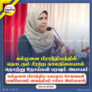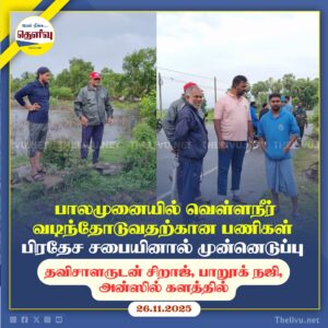 Read Moreபாலமுனையில் வெள்ளநீர் வடிந்தோடுவதற்காக வடிகான் துப்பரவு பணிகள் உவைஸ் தவிசாளர் மேற்பார்வையில் தொடங்கப்பட்டதுடன் முக்கிய பகுதிகள் விரைவாக சுத்தம் செய்யப்பட்டன.