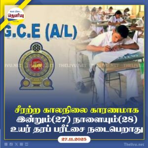 Read Moreசீரற்ற வானிலை மற்றும் அனர்த்த சூழ்நிலை காரணமாக 2025 க.பொ.த. உயர்தரப் பரீட்சை நவம்பர் 27 மற்றும் 28 திகதிளில் நடைபெறாது.