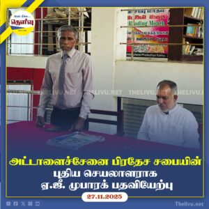 Read Moreஅட்டாளைச்சேனை பிரதேச சபையின் புதிய செயலாளராக 26 ஆண்டு அனுபவம் பெற்ற ஏ.ஜீ. முபாரக் இன்று உத்தியோகபூர்வமாகப் பதவியேற்றார்.