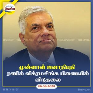 முன்னாள் ஜனாதிபதி ரணில் விக்ரமசிங்க பிணையில் விடுவிக்கப்பட்டார். கொழும்பு கோட்டை நீதிமன்றம் ரூ. 15 மில்லியன் பெறுமதியிலான சரீரப் பிணையில் அனுமதி வழங்கியது.