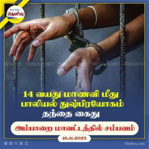 Read Moreஅம்பாறையில் 14 வயது மாணவி மீது தந்தையால் தொடர்ச்சியாக துஷ்பிரயோகம் நடைபெற்றதாக முறைப்பாடு, தந்தை கைது