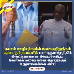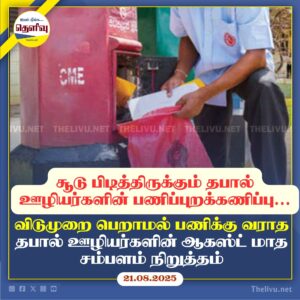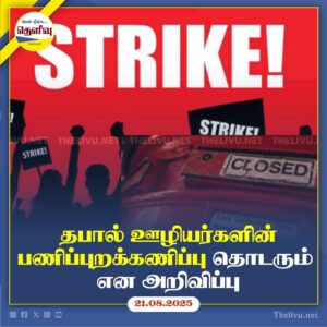 Read Moreதபால் ஊழியர்கள் போராட்டம் தீவிரமடைந்ததால், ஆகஸ்ட் சம்பளம் நிறுத்தம் அறிவிக்கப்பட்டது. 19 கோரிக்கைகள் முன்வைத்து வேலைநிறுத்தம் தொடர்கிறது
