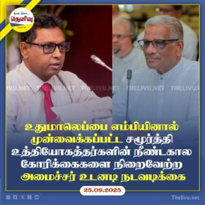 Read Moreசமூர்த்தி உத்தியோகத்தர்களின் பதவி உயர்வு, வெற்றிட நிரப்புதல், தமிழ் மொழி நடைமுறை குறித்த எம்.எஸ். உதுமாலெப்பையின் கோரிக்கைக்கு அமைச்சர் தீர்வு.