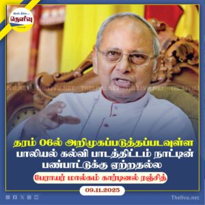 Read More6ஆம் வகுப்பில் அறிமுகப்படுத்தப்படும் பாலியல் கல்வி பாடத்திட்டம் நாட்டின் பண்பாட்டுக்கு பொருத்தமற்றது என கார்டினல் ரஞ்சித் கண்டனம்
